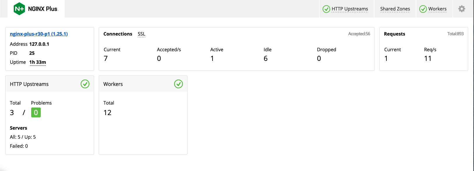 The NGINX Plus dashboard offers a real-time live activity monitoring interface that shows key load and performance metrics of your server infrastructure.